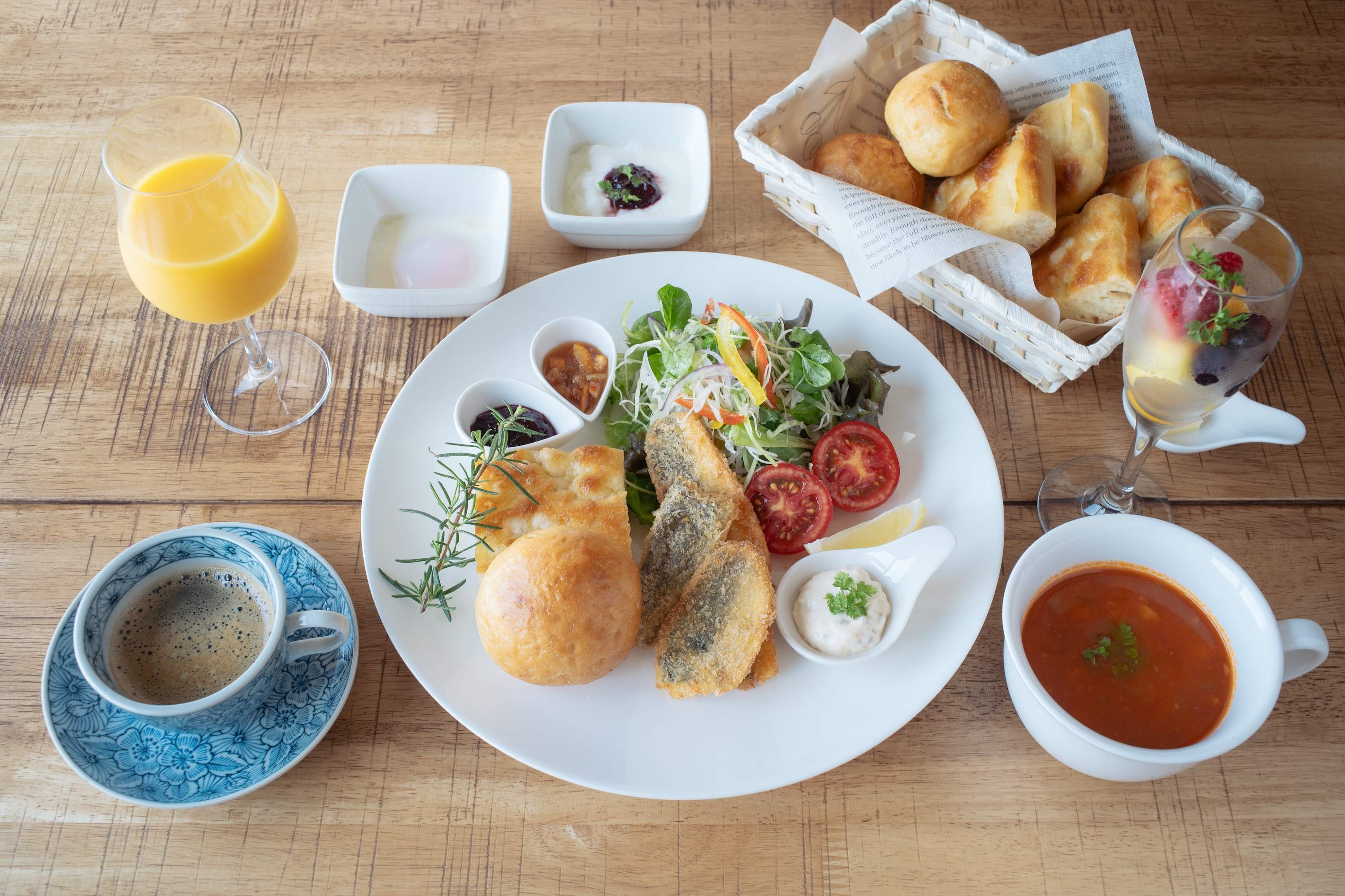 季節の魚や新鮮な野菜など、高島の恵みを一皿にぎっしり詰め込んだ朝食をご提供いたします。自家製のパンも人気。